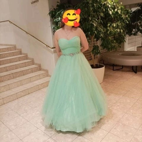 Sininen pitkä mekko, jossa hameessa neljä kerrosta (tästä tarkempi kuva, kolme kangasta ja yksi tyllikerros). Ei siis kaipaa lisähameita, vaan valmis käytettäväksi sellaisenaan.