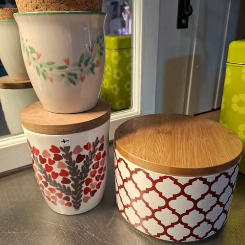 Pentikin Halla-sarjan teepurkit puukansilla. Kansissa kumitiivisteet. Ehjät ja erittäin siistikuntoiset purkit. Hinta 8e/kpl. Myynnissä myös saman sarjan kahvipurkki, josta ei kuvaa. Hinta 15e.