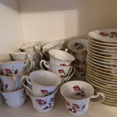 Rheinpfalz Hartporzellan astiasto,upea ruusuaihe kultareunuksella.Minulta löytyy yhteensä 34 osaa eli: