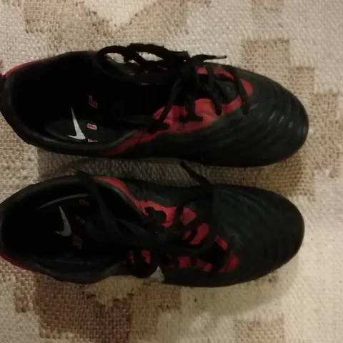 Kengät ovat punaisen ja valkoisen väriset, valmistettu kestävästä materiaalista. Pohjassa on keltaiset nastat, jotka tarjoavat hyvän pidon nurmella ja muilla ulkokentillä. Kengät soveltuvat pesäpallon pelaamiseen ja sisältävät Adidas-logot ja mallinimet. Käytetyt, näkyvissä kulumaa ja likaa kengissä.