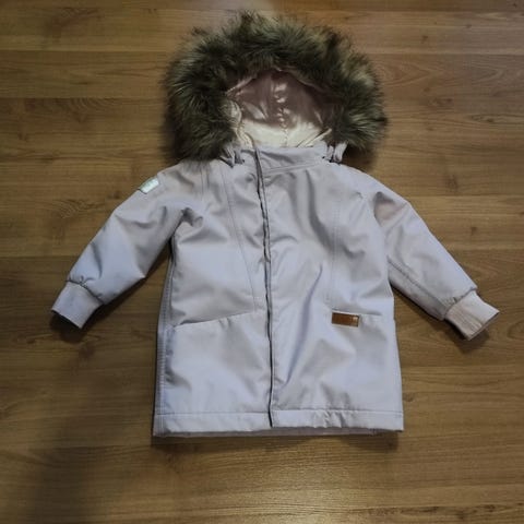 Haalarissa on irrotettava huppu ja tekoturkisreunus, ja ruusukullan värinen vetoketju ja painonapit. Vaaleanpunainen liukas satiinivuori, helppo pienenkin pukea itse päälle. Toisen merkin kirkkaat silikonilenkit vaihdettu lahkeisiin.