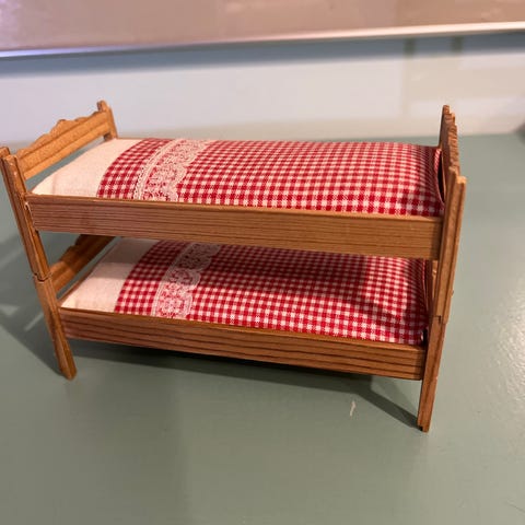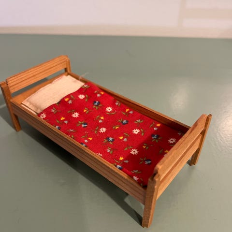 Lundby nukkekoti sänky 80-luvulta. Toinen aluslaatikko puuttuu ja joku läntti petivaatteessa.