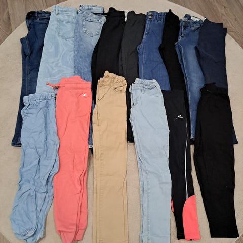 Siistit ja ehjät housut ja paidat 140cm pakettina. Ruskea collegehuppari hm, neule ja housut Lager ja puuvillapaita me&I.