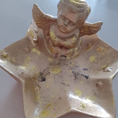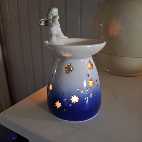 Kaunis hyväkuntoinen enkeli tuoksuastialla, korkeus 9 cm, lisää muutama tippa tuoksuöljyä, raikastaa ilmaa, 5 e + mahdolliset postikulut