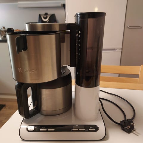 Myydään russel&hobbs kahvinkeitin pois uuden tieltä. Laite on pesty ja pannu on ehjä. Ainoa ”virhe” on keittolevy mistä on teflonpinta kulunut voimakkaan pesuaineen takia, mutta ei vaikuta käyttöön. Mukaan saa vielä aika täyden paketin suodatinpusseja, sopii hyvin yksinasuvalle tai jos kahvia keittelee pieniä määriä. Mukaan kuuluu myös uusiokäyttöinen kahvinsuodatin.