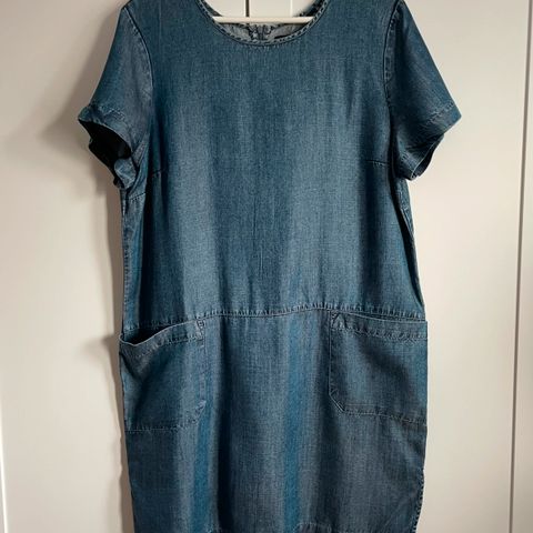 Kiva ja rento farkkutunika / mekko. Ei kokomerkintää, mutta kai-kai n 60 cm suoraksi vedettynä ja olka-helma n 85 cm.