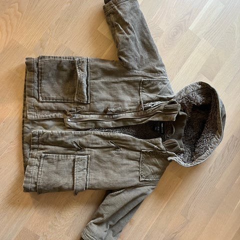 H&M ruskea lasten talvitakki, koko 98. Takissa on irrotettava huppu, joka on varustettu tekoturkisreunuksella. Yksi hupun napeista osittain irti, muuten ehjä.