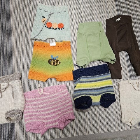 Villavaippahousuja, oikealta Disana 86/92, 12-24 kk. Mannamaan villahousut. Myllymuksut L-XL/10-15 kg, vähän reikiä. Kaikki yhteensä 5 e.