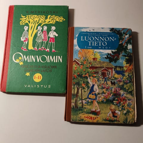 Myyn kuvissa olevat vanhat koulukirjat, osassa on toki muistiinpanoja, alleviivauksia yms sekä kulumisen merkkiä, sillä nämä kirjat ovat kaikki olleet käytössä aikanaan.
