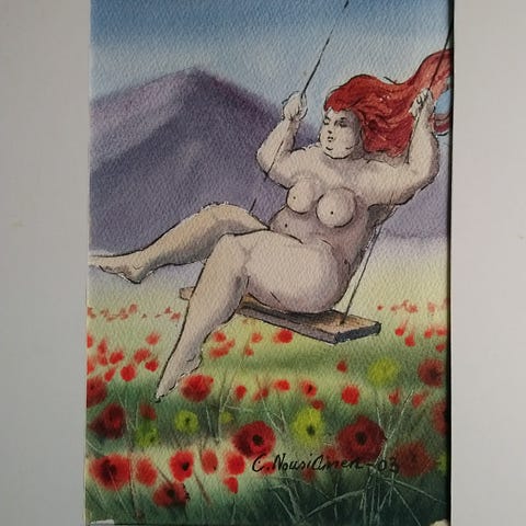 Lappeenrantalaisen taiteilijan Esko Nousiaisen humoristinen akvarellityö vuodelta 2004. Työ siistissä kunnossa, mutta kiinnitetty paspartuuriin maalarinteipillä. Paspartuuri ei ole priimakuntoinen.