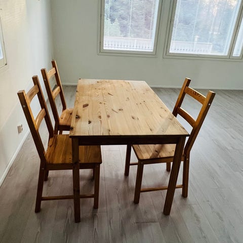 Keittiönpöytä ja neljä tuolia. Tuolit vähän elämää nähneitä.
