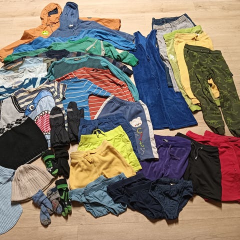 Paketissa esim. t-paitoja, fleece, shortseja, housuja, kauluspaitoja ja uimashortsit. 110-116 kokoiselle lapselle.