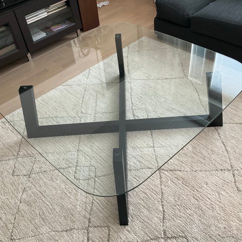 Laadukas teräsrunkoinen sohvapyötä, jossa lasinen pöytälasi.
