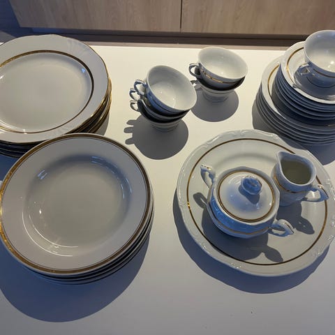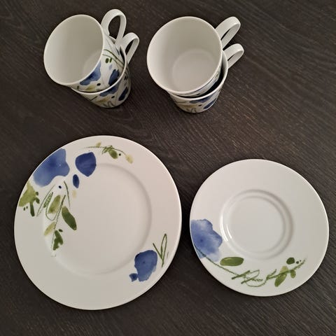 Musta kulmikas astiasto, jossa 4 kpl kahvikuppeja alus- ja kakku lautasineen, kermakko ja sokerikko kannella, 4 +4 kpl kulhoja (kahta kokoa), 2 kpl kynttilänjalkoja, kaksi isompaa erikokoista kulhoa, 10 kpl ruokalautasia.