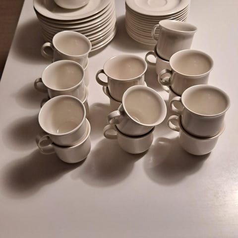 Arabia Arctica kahvikupit ja lautaset valkoisesta. 6 kappaletta kaikkia.