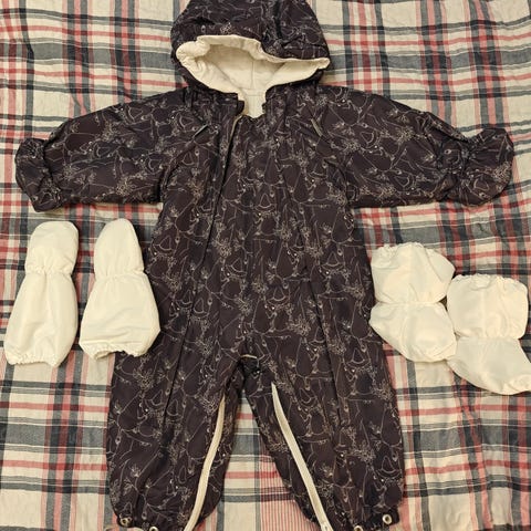 Myydään pari kertaa vaunuissa käytetty äitiyspakkauksen toppahaalari koossa 68-74. Reilu mitoitus. Haalarin saa pussiksi lahkeista vetoketjulla.