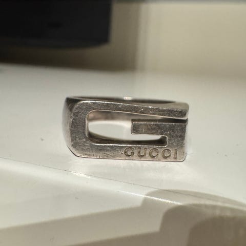 Guccin sormus myytävänä. Hopeasta tehty ja kokoa 19