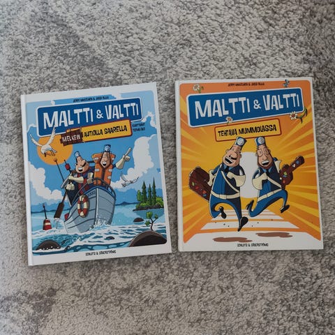 Myydään meille nyt jo tarpeeton lastenkirja Maltti ja Valtti melkein autiolla saarella.