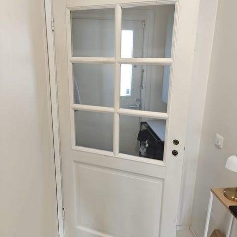 Remontissa yli jäänyt Mattioven ääntä eristävä massiivipuinen väliovi. Väri valkoinen ja pinta alkuperäiskuntoinen. Oven koko 8 x 21.