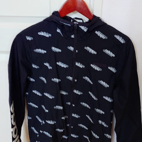 Adidaksen tuulitakki, koko 152 cm, hinta 8 e + postit/nouto Espoosta. Valkoisissa raidoissa aavistus tummentumaa. MMM.