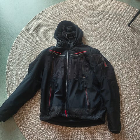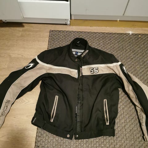 Richa D2XL moottoripyöräasu, joka sisältää mustan takin ja housut. Asu on valmistettu kestävästä materiaalista ja siinä on hengittävä verkkovuori. Koko D2XL.
