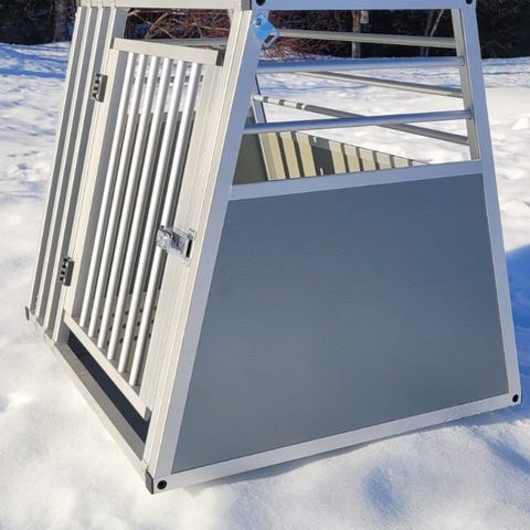 Ritilä-ovi on pinnoitettua metallia, joka aukeaa molempiin suuntiin. Ritilän saa tarvittaessa kokonaan pois. Katolla kahva kantamista varten.