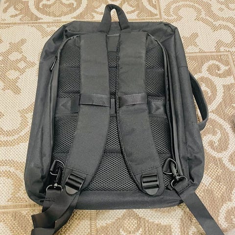 Käyttämätön reppu. Korkeus 45 cm, leveys 38 cm. Jokin pieni pilkku tullut päällitaskuun, näkyy kuvissa.