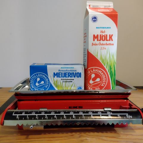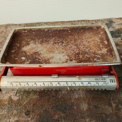 Eks Mari talousvaaka. Ajan patinaa paikoin näkyvissä. Postitus 8,90e.