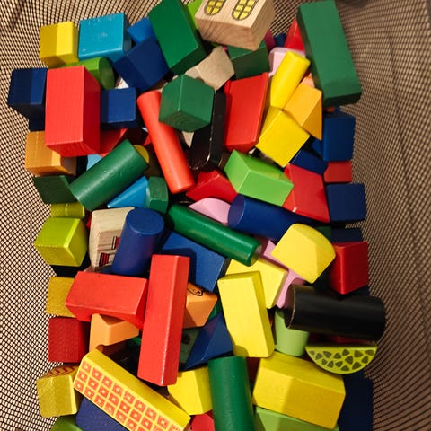 Myydään pussillinen muovisia ja puisia rakennuspalikoita ja työkaluja.