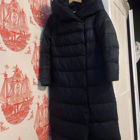 Uusi ja lapullinen Armani untuvatakki. Huppu osa ja olkapäät mustaa samettia ja loppu osa mustaa toppatakki kangasta, jossa untuva sisälmys.