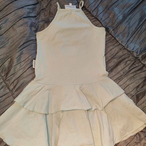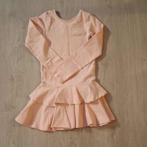 Gugguu frillamekko muutamia kertoja pidetty yhdellä. Jotain hailua jälkeä edessä, ei juuri näy. Koko vastaa enemmän 122.