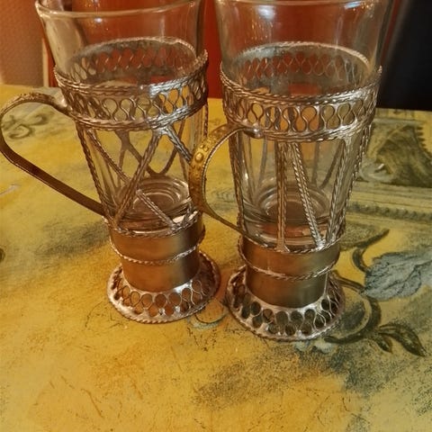 Tee lasit , koristeelliset, osista kultaus hieman kulunu. Muuten täysin ehjät .