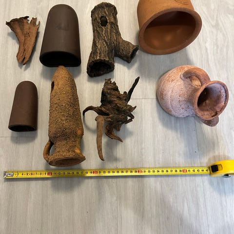 Myydään mieluiten yhdessä kaksi juurakkoa, laavakivi piilo/tunneli, keraaminen kallo. Hinta yht. 15€ Vaatii ehkä vielä pesua.