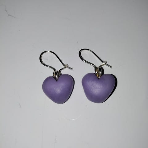 Violetit Eila Designin sydänkorvakorut. Kunto hyvä, hopea hieman tummunut. Säilytetty alkuperäisessä rasiassa.