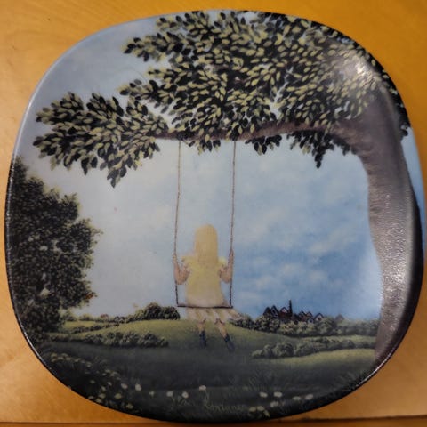 Arabia Päivänkakkara lautainen, jossa kukkakuvio sinisellä taustalla. Lautanen on valmistettu posliinista ja siinä on koristeena päivänkakkaroita ja muita kukkia. Design: Tove ja O. Utamainen.