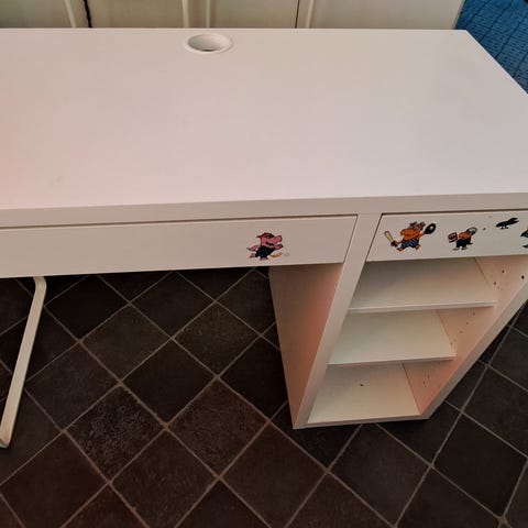 IKEA lasten pöytä, jossa valkoinen taso ja luonnonväriset puiset jalat, joiden alaosat on maalattu punaisella ja sinisellä. Sopii lasten käyttöön esimerkiksi askartelu- tai työpöydäksi.