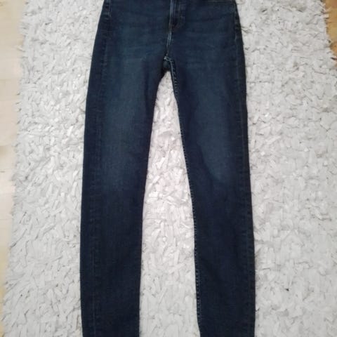 Tummansiniset Lee-farkut. Koko ehkä S. Vyötärönympärys n. 66 cm. Lahkeen pituus sisäsaumasta mitattuna 74 cm. Lahkeen leveys nilkasta 14 cm, polven kohdasta n. 17 cm, reiden kohdalta n. 20-22 cm.