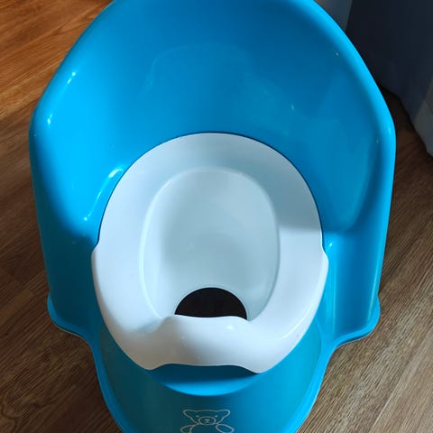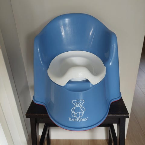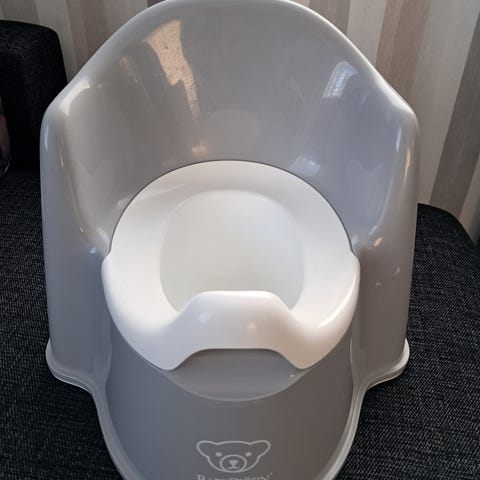 Babybjörn lasten potta, valmistettu valkoisesta muovista. Sopii pienten lasten käyttöön ja on muotoiltu ergonomisesti mukavuuden takaamiseksi.