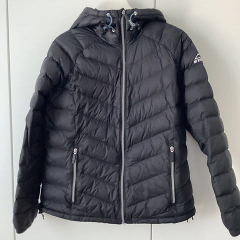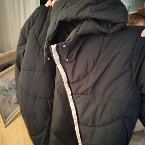 Musta lämmin untuvatakki jossa irrotettava huppu. K-k 63 cm. Koko 46