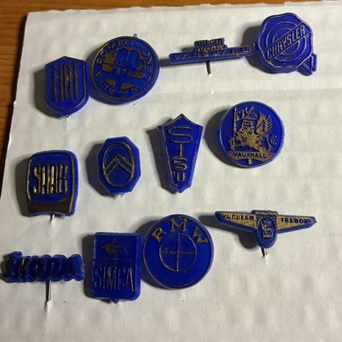 Antiikkinen tšekkiläisen autoyhtiön Skoda-aiheinen neulamerkkikokoelma.