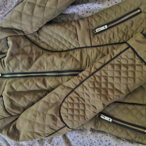 Tummanvihreä (kuva vääristää väriä). Tikattu kevät/syys takki.