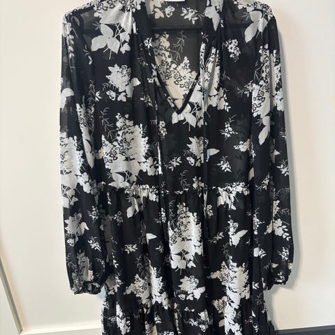Naisten paita/mekko, jossa on harmaa kukkakuvioinen kangas ja läpikuultava yläosa. Mekon koko on 40. Mekko on valmistettu kevyestä materiaalista ja sopii erilaisiin tilaisuuksiin.
