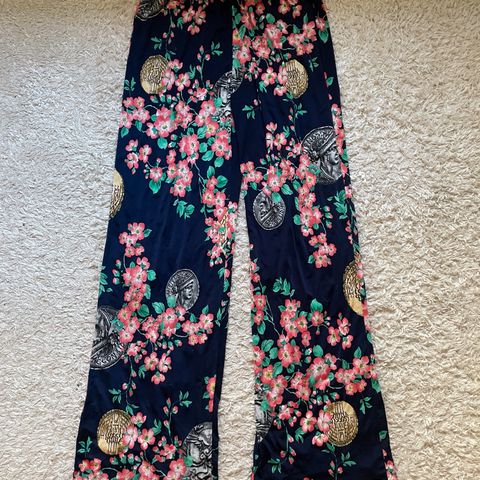 Tummat kukkahousut koossa 12. Taskut löytyy ja kunto hyvä.