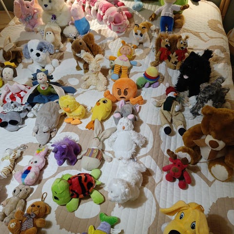 Erilaisia pehmoleluja, myydään mielellään pakettina.