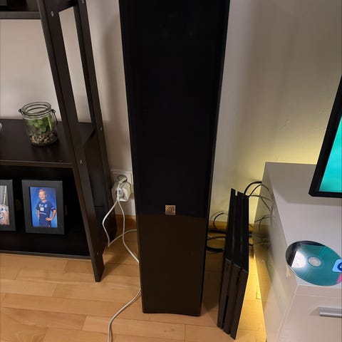 Kauniisti soivat Ruotsalaisvalmisteiset lattiakaiuttimet. Väri harmaa/ musta/puu. Korkeus 96cm, leveys 22cm,syvyys 30cm