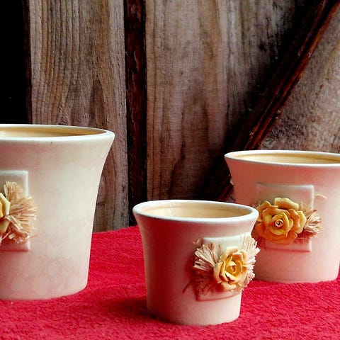 Näitä otsikonmukaisia kukkaruukkuja aurinkosomisteella yhteensä 18 kpl sarja. Hinta 80€ kaikki tai 6kpl 30€, yksitellen 10€ kpl. Tarjoa koko setti tai erikseen . Yhdessä paketissa aina siis kuvassa olevat 2kpl 15cm ja 13cm halkaisijaltaan kukkaruukkuja.