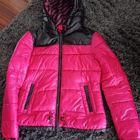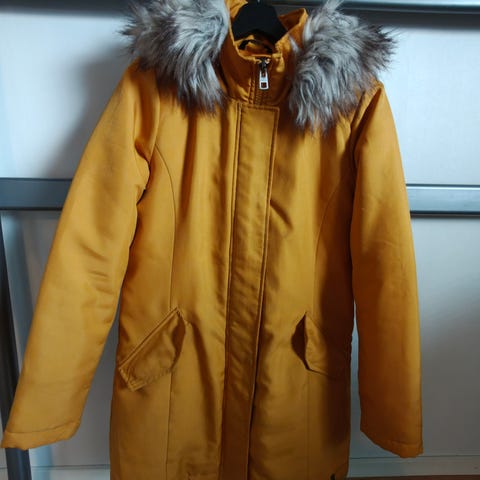 Kevyt ja lämmin vuorellinen takki, koko S, melko napakka malli (minkä takia myyn). Ei huppua, tuplavetoketju (mutta vain yksi osainen), vähän epäsymmetrinen malli (vetoketju ei ihan keskellä), taskut löytyy. Väri kirkas keltainen. Kevyttoppatakki, sopii hyvin myös syksyllä/keväällä.