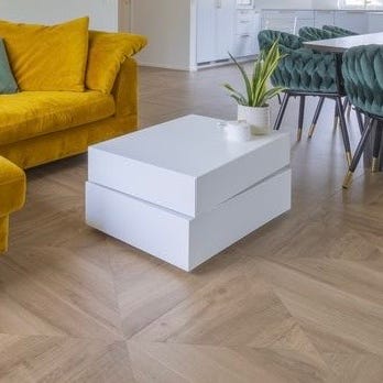 Neliönmuotoinen sohvapöytä. Hieman kaartuvat jalat.