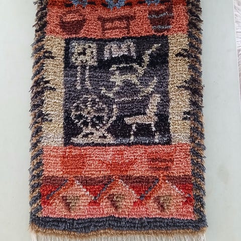 Käsin tehty seinävaate, jossa on kukkakuvio. Taustaväri on musta, ja kuvioissa esiintyy punaisia, vihreitä, sinisiä ja valkoisia sävyjä. Sopii sisustuselementiksi seinälle.