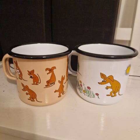 Muurlan kaksi Eemeli emalimukia, isompi 2,5dl ja pienempi 1,5dl.